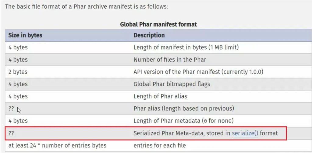 • stub phar:这是phar文件标识,格式为xxx<?php xxx;__HALT_COMPILER();?>(头部信息),这是 PHAR 文件的入口点,当 PHP 解释器加载 PHAR 文件时,会首先执行 Stub 代码