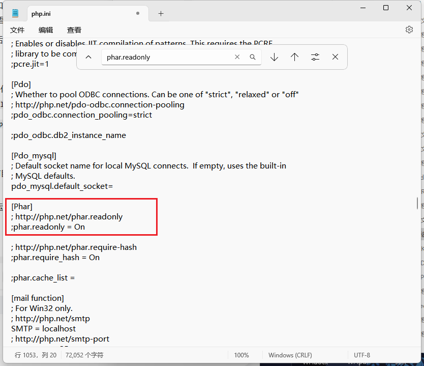 直接搜索找到phar.readonly就行,以下是原本的样子