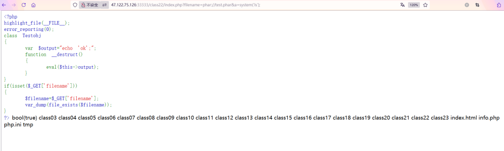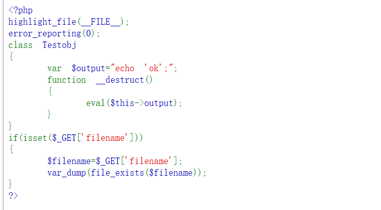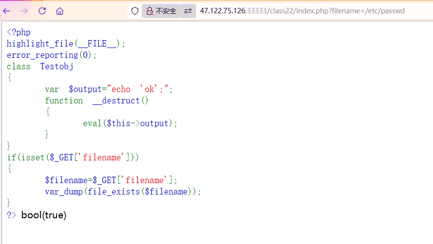 • 在漏洞页面index.php的源码中,定义了Testobj这个类,有一个属性output,和一个__destruct()魔术方法,会执行output的内容,这里可以进行RCE执行命令